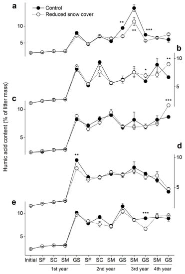 Humic acid contents (±SE, n = 6) in the five foliar litters. (a) Cypress, (b) larch, (c) birch, (d) willow and (e) azalea. SF: snow formation stage, SC: snow cover stage, SM: snowmelt stage, GS: growing season. * p < 0.05, ** p < 0.01, *** p < 0.001.