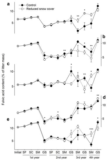 Fulvic acid contents (±SE, n = 6) in the five foliar litters. (a) Cypress, (b) larch, (c) birch, (d) willow and (e) azalea. SF: snow formation stage, SC: snow cover stage, SM: snowmelt stage, GS: growing season. * p < 0.05, ** p < 0.01, *** p < 0.001.