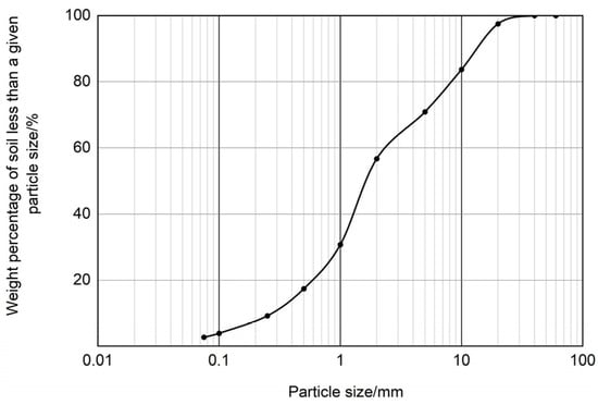 The soils were obtained from Beijing, China (about 40°28′ N, 115°58′ E). Sieving method was used in the particle analysis test. The particle size distribution of the tested soils is shown in Figure 1 and Table 1. The soil is well-graded sand with clay and gravel (SW-SC) according to the unified soil classification system (USCS) [39] and its basic physical properties [40,41] are shown in Table 2.