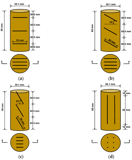 Below the surface depth of 0.5 m, the enhancement effect of roots on the soil strength will be greatly weakened with the decrease of the number of roots. Therefore, the confining pressures (50 kPa, 100 kPa, and 150 kPa) were chosen to effectively evaluate the influence of roots on the soil strength. To study the influence of root distribution angles on soil strength, four root distribution angles (0°, 30°, 60°, and 90°, respectively) were employed and the root distribution patterns are shown in Figure 2.