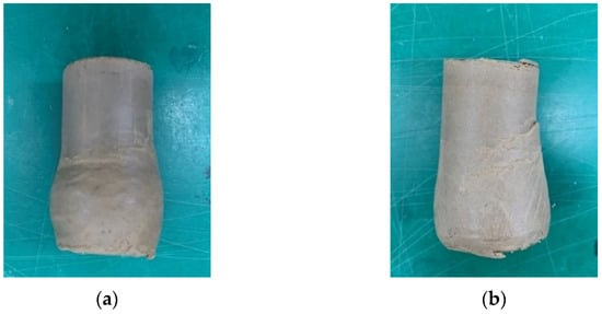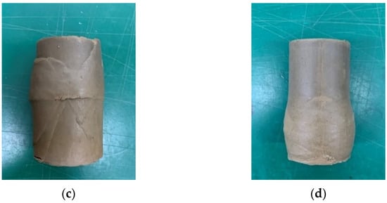 Figure 3 shows the obvious axial and lateral deformation of all samples. In Figure 3a,d, there is no clear failure surface in the root-soil composites with obvious lateral deformation for the root distribution angle of 0° and 90°. Meanwhile, the lateral deformation rate was 13.1% for α = 0° and 10.9% for α = 90°. In Figure 3b, the failure surface did not run through the whole sample with the run-through rate of 48.7% when α = 30°. Additionally, the main lateral deformation rate was 14.9%. Figure 3c shows an obvious failure surface of the 60°-distribution-angle composite with a 79.5% run-through rate and lateral swelling (17.0% lateral deformation rate) which appeared in the middle of the sample. However, compared with the unreinforced soil, the development of the failure surface for the rooted soil samples was greatly restrained.