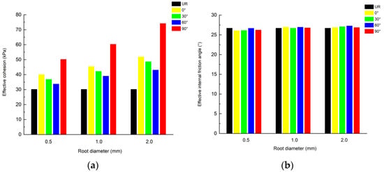 Under the condition of d = 1.0 mm, the effective cohesion of the root-soil composites increased in the order of 60°, 30°, 0°, and 90° distribution angles and was greater than that of the unreinforced soil. increased by 50.6% for α = 0° and 99.8% for α = 90°. What is more, compared with the unreinforced soil, the effective internal friction angle of the root-soil composites slightly increased.