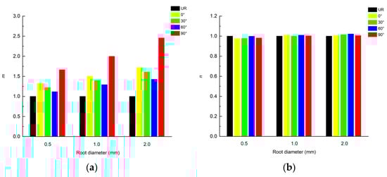 The parameter n was less than 1.000 for the 0.5-mm-diameter root in the root-soil composites. Under the condition of the 1.0-mm-diameter root, n was more than 1.000 for the root distribution angles of 0°, 60°, and 90°, while n = 1.000 for the root distribution angle of 30°. Under the 2.0-mm-diameter root condition, the values of n were all more than 1.000 for the different root distribution angles. Regardless of diameter, m exceeded 1.000 for all root-soil composites and decreased in the order of 90°, 0°, 30°, and 60° of root distribution angles (α). Moreover, the maximum value of n was 1.022 and that of m was 2.458.