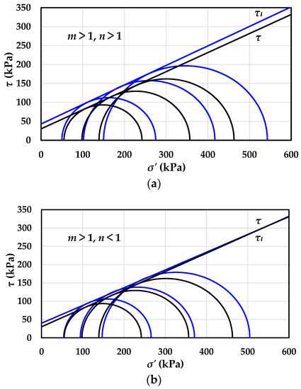 There are two different conditions, as shown in Figure 6. and denote the shear strength of the unreinforced soil and the root-soil composites, respectively. Considering the root distribution angles and the root diameters, there are several shear strength envelope relationships of the unreinforced soil and the root-soil composites. In Figure 6a, when m = 1.426 and n = 1.002, meaning that > 0 and > 0, the shear strength envelopes of the root-soil composites are commonly larger than the shear strength envelope of the unreinforced soil. Figure 6a presents the envelopes of the shear strength of α = 60° under d = 2.0 mm. Figure 6b presents the envelopes for a 0.5-mm-diameter-root composite with α = 0°. In Figure 6b, when m = 1.326 and n = 0.978 (i.e., > 0 and < 0), the shear strength envelope of the root-soil composites is smaller than that of the unreinforced soil. Additionally, Figure 6 demonstrates that the changes of the root reinforcement coefficients affect the failure principal stress of the root-soil composites. The failure principal stress of the root-soil composites decreases with decreasing n and m.