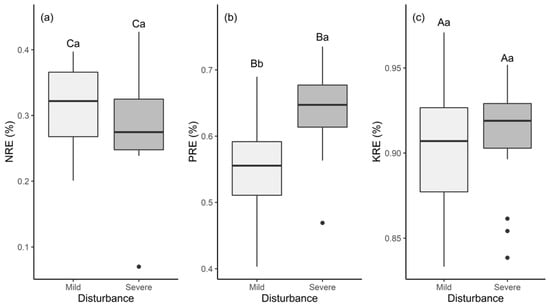 The nitrogen resorption efficiencies (NRE), phosphorus resorption efficiencies (PRE), and potassium resorption efficiencies (KRE) under the mild and severe disturbances (a–c) in the Phoebe bournei forest. The boxes represent the middle 50% of the data. The median line in the boxplot represents the median. Dots represent outliers. Different capital letters represent different nutrient resorption efficiencies under each disturbance. Different small letters represent significant nutrient resorption efficiencies under different disturbances.