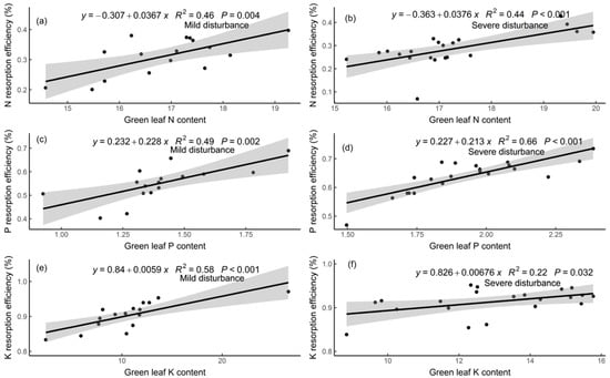 Relationships between nutrient resorption efficiencies and green leaf nutrient contents under mild (a,c,e) and severe (b,d,f) disturbances in the Phoebe bournei forest. N: nitrogen, P: phosphorus, K: potassium. The shaded area represents the 95% confidence interval of the regression line.