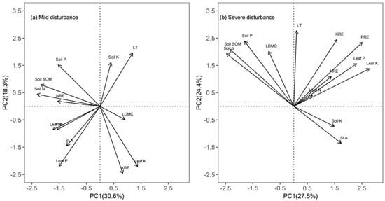 Principal component analysis (PCA) of nutrient resorption efficiencies, green leaf nutrient contents, soil nutrients, and leaf traits under the mild (a) and severe (b) disturbances in the Phoebe bournei forest. Leaf N: green leaf nitrogen content. Leaf P: green leaf phosphorus content. Leaf K: green leaf potassium content. SLA: specific leaf area. LT: leaf thickness. LDMC: leaf dry matter content. NRE: nitrogen resorption efficiencies. PRE: phosphorus resorption efficiencies. KRE: potassium resorption efficiencies. Soil N: soil total nitrogen content. Soil P: soil total phosphorus content. Soil K: soil total potassium content. Soil SOM: soil organic matter.