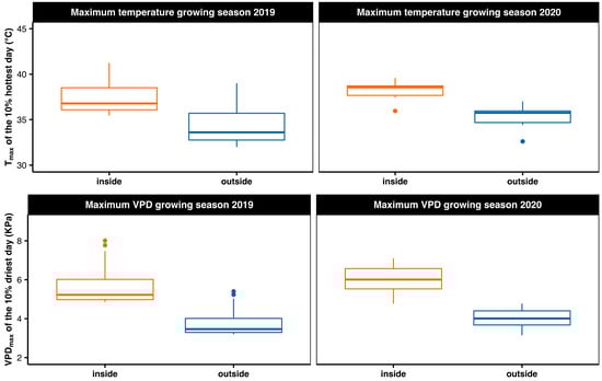 Boxplots showing the micro-climatic growing conditions in the greenhouse (inside) and open-field measurements at 2 m height (outside) during the growing season from May to September in 2019 and 2020. Given are the daily maximum temperature (Tmax, °C) for 10% of the hottest days as well as the daily maximum vapour pressure deficit (VPDmax, kPa) for 10% of the driest days of each growing season. Please note that only the outside microclimatic data are available for both years, the inside values have been modelled based on data from 2021 (refer to Figures S1 and S2 for details).