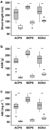 Boxplot of growth-related traits of Acer pseudoplatanus (ACPS), Betula pendula (BEPE), and Sorbus aucuparia (SOAU) for the control (grey) and stress (white) treatment. Presented are (a) shoot length, (b) aboveground biomass (AGB), and (c) aboveground biomass increment (ABI). Asterisks indicate the level of significance (***, p < 0.001; ns, for non-significant).