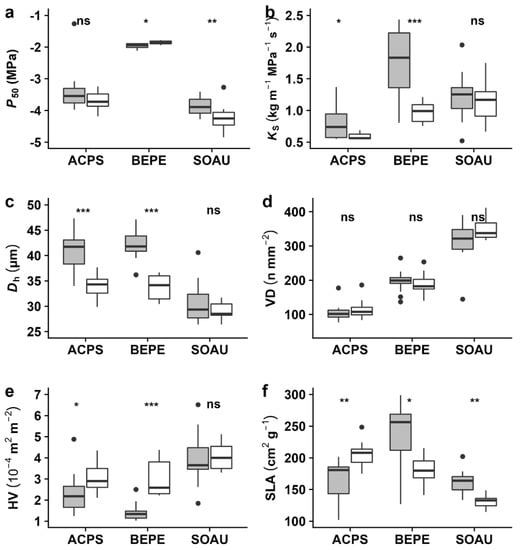 Boxplot depicting the variability between treatments for hydraulic, wood anatomical, and leaf morphological traits for the three species. Given are (a) water potential at 50% loss of hydraulic conductivity (P50), (b) specific conductivity (KS), (c) hydraulically-weighted vessel diameter (Dh), (d) vessel density (VD), (e) Huber value (HV), and (f) specific leaf area (SLA) for the control (grey) and stress (white) treatment. Asterisks indicate the level of significance (*, p < 0.05; **, p < 0.01; ***, p < 0.001; ns, for non-significant). For species abbreviations, see Figure 1.