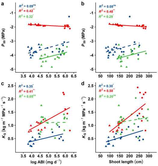Effect of growth performance on the water potential at 50% loss of hydraulic conductivity (P50) and specific conductivity (KS). Given are linear regression analyses between (a) P50 or (c) KS and log-transformed growth rate, and (b) P50 or (d) KS and shoot length. Indicated for each species are the coefficients of determination, i.e., R-squared, for the investigated relationships. Different colours and symbols represent different species and treatments (blue: A. pseudoplatanus; red: B. pendula; green: S. aucuparia; filled circles: control treatment; triangles: stress treatment). Full lines indicate significant effects of variable x on variable y; dashed lines indicate a non-significant relationship. Asterisks indicate the level of significance ( *, p < 0.05; **, p < 0.01; ns, for non-significant).