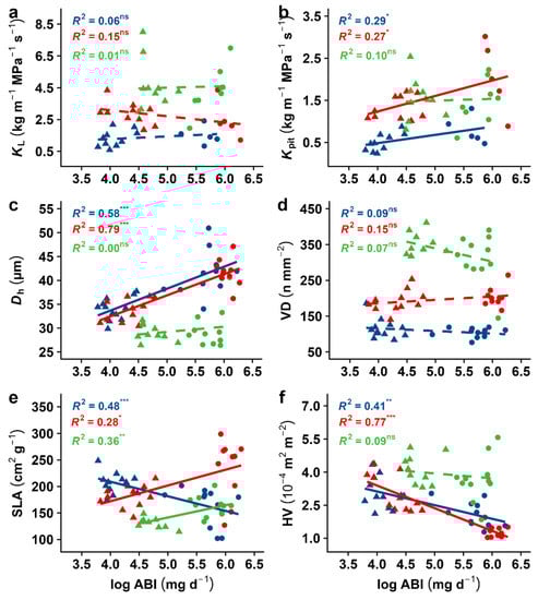 Dependency of growth rate on wood anatomical and leaf morphological traits. Given are linear regression analyses of log-transformed growth rate against (a) leaf-specific conductivity (KL), (b) pit conductivity (Kpit), (c) hydraulically-weighted vessel diameter (Dh), (d) vessel density (VD), (e) specific leaf area (SLA), and (f) Huber value (HV). Different colours and symbols represent different species and treatments (blue: A. pseudoplatanus; red: B. pendula; green: S. aucuparia; filled circles: control treatment; triangles: stress treatment). Indicated for each species are the coefficients of determination, i.e., R-squared, for the investigated relationships. Full lines indicate significant effects of variable x on variable y; dashed lines indicate a non-significant relationship. Asterisks indicate the level of significance ( *, p < 0.05; **, p < 0.01; ***, p < 0.001; ns, for non-significant).
