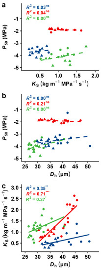 Water potential at 50% loss of hydraulic conductivity (P50) in relation to (a) specific conductivity (KS) and (b) hydraulically-weighted vessel diameter (Dh), as well as (c) specific conductivity (KS) in relation to hydraulically-weighted vessel diameter (Dh). The results from the linear regression analyses are given. Different colours and symbols represent different species and treatments (blue: A. pseudoplatanus; red: B. pendula; green: S. aucuparia; filled circles: control treatment; triangles: stress treatment). Indicated for each species are the coefficients of determination, i.e., R-squared, for the investigated relationships. Full lines indicate significant effects of variable x on variable y; dashed lines indicate a non-significant relationship. Asterisks indicate the level of significance ( *, p < 0.05; **, p < 0.01; ***, p < 0.001; ns, for non-significant).