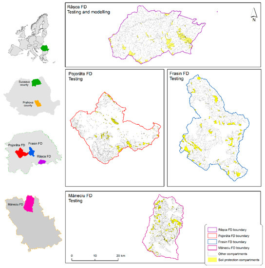 Three of the selected FDs are in the northern part of Romania and, to complement the study, we chose the Măneciu FD from the central part of the country (Figure 1).