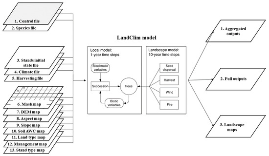 LandClim is a spatially explicit process-based model that incorporates competition-driven forest dynamics and landscape-level disturbances to simulate forest dynamics on a landscape scale [37]. It was designed to examine the impact of climate change and forest management [38].