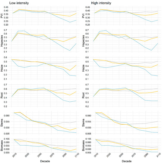 The positive effects of high-intensity management on PVI and its indicators can be observed only in the second half of the moderate climate simulation (Figure 3). However, overall, the differences between management types did not strongly influence PVI and indicators evolution.