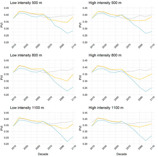 The mean PVI evolution in the first 50 years has been influenced more by climate than management scenarios. However, in the last 50 years of the simulation period, the slight differences between low- and high-intensity management continued in mild and extreme climate projections.
