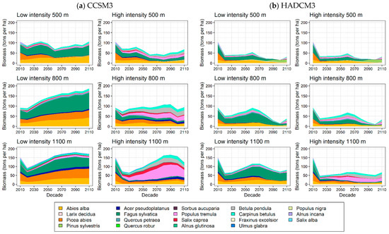 Species composition and biomass dynamic between 2010 and 2110, in respect to elevation (500 m, 800 m and 1100 m classes), management strategies (low- and high-intensity management), and climate scenarios (mild–CCSM3 (a) and extreme–HADCM3 (b)).