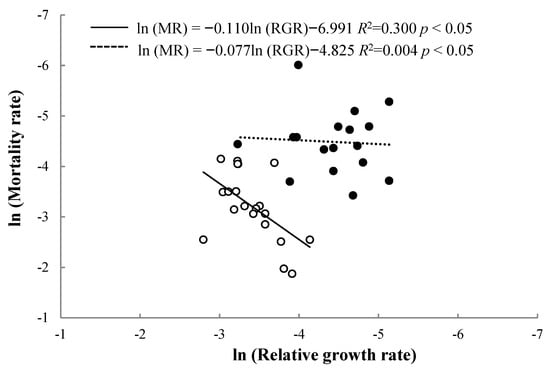 The relationship of tree size between growth rates and mortality rates is perhaps the best-established life-history variation among forest tree species [,,]. We showed that the strength of the relationships between RGR and MR depends strongly on the life stages of the trees evaluated. The relationships between RGR and MR are stronger for saplings than for large trees. Saplings have faster growth and mortality among individuals compared with large trees. This result is similar to the effect of density dependence for sapling-to-large tree transitions []. Although trees in both life stages were affected by this effect, the effect was more pronounced in the early stages, which showed higher growth rates and mortality in the old-growth temperate forest.