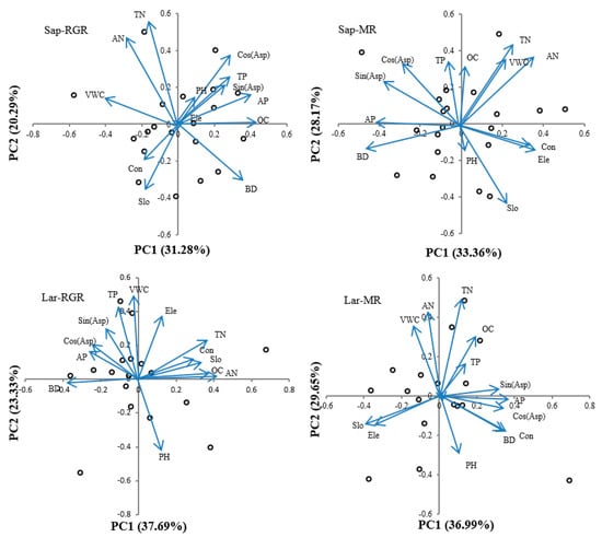 All the principal components were selected for the first three axes (PC1, PC2, and PC3) because the eigenvalues were greater than one (Table 3). For PCA, axis 1 (PC1) of Sap-RGR was related to increasing OC and AP; axis 2 (PC2) was related to increasing TN and AN; and axis 3 (PC3) was related to increasing Ele and TP. This analysis showed that the highest values were related to increasing OC. In Sap-RGR, Asp (Sin (Asp) and Cos (Asp)) were strongly negatively correlated with Con and Slo. PC1 of Sap-MR was related to declining BD and AP; PC2 was related to increasing TN and AN; and PC3 was related to declining OC and increasing Ele. This analysis showed that the highest values were related to increasing TN. In Sap-MR, OC and VWC showed a strong positive correlation, whereas OC was strongly negatively correlated with Slo. PC1 of Lar-RGR was related to increasing OC and AN; PC2 was related to increasing TP and VWC; and PC3 was related to increasing AP and declining VWC. This analysis showed that the highest values were related to increasing TN. In Lar-RGR, OC and Slo showed a strong positive correlation. PC1 of Lar-MR was related to declining Slo and increasing AP; PC2 was related to increasing TN and AN; and PC3 was related to increasing VWC and declining Slo. This analysis showed that the highest values were related to increasing TN. In Lar-MR, OC was strongly negatively correlated with Slo (Table 3 and Table 4, Figure 2).