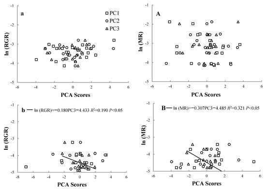 Linear regression of RGR and MR shown as PCA scores at different life stages. The straight line indicates that the PCA scores are significantly correlated with RGR and MR. The letter (a,A) represents saplings (1 cm ≤ DBH < 10 cm). The letter (b,B) represents large trees (DBH ≥ 10 cm).