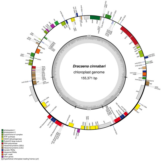 The sequences of chloroplast (cp) genomes obtained as a result of next-generation sequencing (NGS) are a valuable source of data for taxonomy, conservation genetics, and phylogenetics. Their high usefulness in these areas has been repeatedly confirmed, both in the case of representatives of the Asparagaceae family, i.e., Asparagus officinalis L. [22], Asparagus setaceus (Kunth) Jessop [23], Convallaria keiskei Miq. or Liriope spicata (Thunb.) Lour. [24] and in the genus Dracaena, i.e., D. cochinchinensis (Lour.) S.C. Chen, D. cambodiana Pierre ex Gagnep, D. angustifolia (Medik.) Roxb., D. terniflora Roxb., D. hokouensis G.Z. Ye and D. elliptica Thunb. [25] or recently, D. draco (L.) L. [26]. However, no similar study has been published to date on the detailed characterization of the chloroplast genome features for D. cinnabari. There is an urgent need to fill this gap and provide missing data.