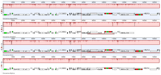 Complete chloroplast genomes alignment of four selected species of Dracaena, i.e., D. angustifolia, D. cinnabari, D. draco, and D. elliptica, was done using Mauve software (Figure 2). The results obtained in the previous paragraph clearly showed that no major changes in the structural organization of the cp genomes in Dracaena could be expected. In fact, genome-wide alignment revealed the presence of only one locally collinear block (LCB) between all the complete chloroplast genomes analyzed. This indicates an extremely high level of similarity in the genome organization between the analyzed Dracaena species and the absence of any evolutionary events such as gene loss, duplication, rearrangements, and translocations.