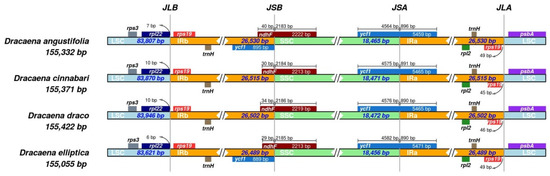 The obtained results of the whole genomes comparison are also confirmed by the contraction and expansion analysis of the IR regions. In general, the IRb/LSC border is located between rps19 and rpl22 genes, and the IRa/LSC border is located between rps19 and psbA genes. The ycf1 gene spanned the JSA (SSC/IRa) region, and the ndhF gene spanned the JSB (IRb/SSC) region in the species studied. Moreover, in the JSB region, the ycf1 pseudogene is present only in D. angustifolia and D. elliptica, but not in D. cinnabari and D. draco. A comparison of the IR/SSC and IR/LSC boundaries for the four Dracaena cp genomes is shown in Figure 3.