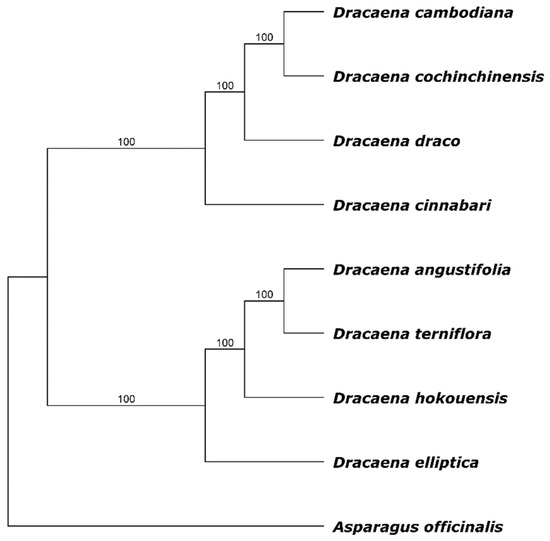 In this study, we paid particular attention to determining the phylogenetic position of D. cinnabari within the Dracaena genus. Therefore, we constructed a phylogenetic tree using the maximum likelihood algorithm and the complete cp genome sequences of nine members of Asparagaceae. The phylogenetic inference revealed that all species of the Dracaena genus formed one separate cluster and that D. cinnabari is much closer to D. draco, D. cochinchinensis, and D. cambodiana than to D. terniflora, D. angustifolia, D. hokouensis, and D. elliptica. Such grouping of species is consistent with their morphological and physiological characteristics. The results obtained in this study confirm the previously published phylogeny of the Dracaena genus reported by Zhang et al. [25] and Celiński et al. [26]. However, the cited studies did not include D. cinnabari, and our current research fills this gap perfectly. Moreover, our findings strongly support the conclusions of Takawira-Nyenya et al. [44] about the monophyletic origins of Dracaena.