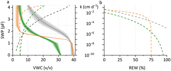 (a) Mean planting soil water retention curves (left y-axis) determined by pressure chamber, HYPROP, and field measurements in the three planting soils ‘Sand‘ (orange), ‘FLL‘ (green), and ‘Loamy Silt‘ (grey). SWP is the soil water potential and VWC is the volumetric water content. Shaded areas highlight the standard deviation (light) and the standard error (dark). Dashed lines show the log-transformed fitted hydraulic conductivity (k) (right y-axis) as a function of VWC determined by the HYPROP apparatus; (b) log-transformed fitted hydraulic conductivity (k) as a function of the REW (relative extractable water) determined by the HYPROP apparatus.