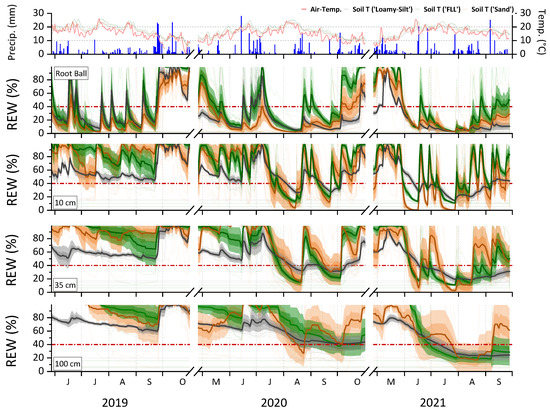 Dynamics of relative extractable water (REW %) at three depths and within the root ball in the three different planting soils (‘Sand‘(orange), ‘FLL‘(green), and ‘Loamy Silt‘(grey)) during the growing seasons of 2019, 2020, and 2021. Bold lines represent the means of all investigated planting pits per planting soil. Shadowed areas indicate the standard error (dark) and the standard deviation (light). Reddish dashed lines show a threshold value of 40% REW. Corresponding precipitation, air, and soil temperatures are given at the top of the graph.