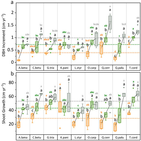 (a) Boxplots of annual DBH growth and (b) annual shoot growth of all nine tree species and as a mean of the years 2020–2021. Colored dashed lines show the mean growth across all species for the three planting soils ‘Sand‘ (orange), ‘FLL‘ (green), and ‘Loamy Silt‘ (grey). Statistical analyses were performed by using a one-way ANOVA. Boxes with the same letters (black) indicate no significant differences at the p ≤ 0.05 level within a species between the planting soils. Boxes with the same letters (see color assignment above) indicate no significant differences at the p ≤ 0.05 level within a planting soil between the species. Mean comparisons were performed by Tukey post hoc comparisons.