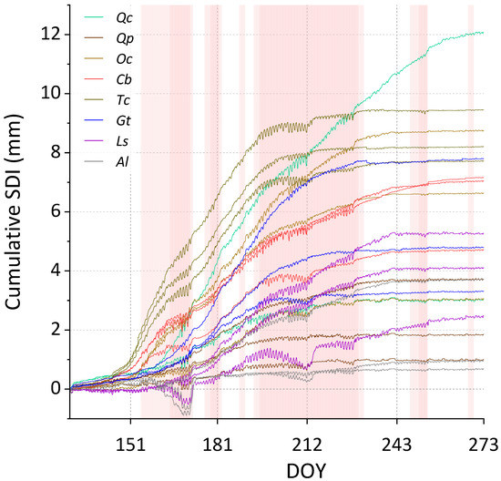 Cumulative stem diameter increment (SDI) of eight tree species grown in ‘Sand’ during the growing season of 2021. Reddish areas indicate phases when REW was <40% (light red: 0–35 cm; dark red: 0–100 cm).