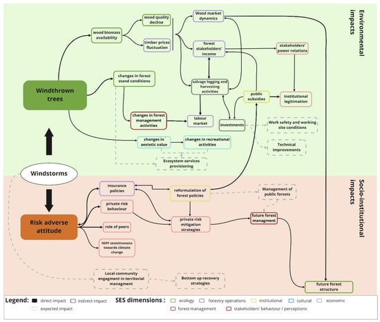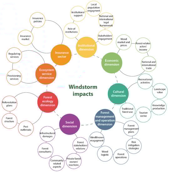 Lastly, considering that windstorms can have multiple impacts in one dimension and can affect multiple stakeholders, each dimension was further divided into two specific categories: (i) macro-categories that refer to specific thematic subsets connected with a certain forest SES dimension (Figure 1), and (ii) sub-categories that identify a cluster of windstorm effects related to a specific sector or stakeholder group. Impacts found in the scientific literature analyzed were grouped into specific categories according to the dimension of reference and actors/sectors affected. This categorization enabled the identification of windstorm cause–effect linkages affecting multiple sectors and stakeholders of the European forest context.