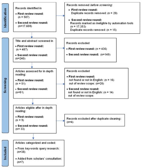 From the two review rounds, 18,115 potentially relevant papers were retrieved. For the sake of clarity, it is necessary to clarify that such a high number of papers comes from the removal of “Europe or European” keywords in the second round. Thus, the second round included a relevant amount of Non-European studies that were excluded during the skimming procedure.
