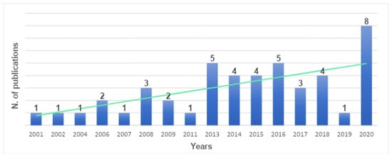 The trends in publications reflect the general increase in academic interest in the analysis of natural disturbances experienced at the beginning of the 21st century [20,69]. Whilst academic literature reports an increase in storminess starting from the beginning of the 1990s [59,70], papers retrieved within this review focused only on windstorms happening from the end of the 1990s onwards. All the articles were published between 2000 and 2020, with an important increase in publications between 2010 and 2020: 76% of the overall papers categorized were published from 2011 onwards, with an average of four publications per year (Figure 3).