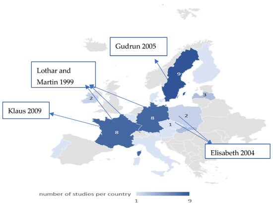 Concerning the windstorms analyzed, most of the articles reviewed (63%) focused on large-scale windstorms that have affected European forests in the last few decades, namely Lothar and Martin (1999) in France, Switzerland and Germany, Elisabeth (2004) in Slovakia, Gudrun (2005) in Sweden and Klaus in France (2009) (Detailed data and information as well as comparative assessments of windstorms mentioned are available within the existing literature, including (but not limited to the following articles and books (see: Gardiner et al., 2010; Gardiner et al., 2013; Roberts et al., 2014; Hewson and Neu 2015; Feser et al., 2015; Forzieri et al., 2020)). The remaining articles did not base their analysis on empirical data connected to a specific windstorm. Rather, they estimated windstorm impacts by simulating changes in selected variables through modeling. The study areas analyzed were concentrated in Northern/Central European countries, even for articles using simulations to predict wind hazard impacts. The majority of studies were conducted in Sweden (n = 9), followed by France and Germany (n = 8 each) and Latvia, Switzerland and Slovakia (n = 3 each) (Figure 4). The geographical concentration of studies was an expected result because Northern/Central European countries experienced the majority of extreme windstorms that have affected Europe in the last three decades [15,21]. Moreover, within most of these countries, the forestry sector and forest-based industry have, traditionally, major economic importance in terms of contribution to the gross domestic product, thus attracting attention from researchers and policy makers.