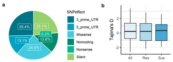Summary of SNP effects (a) and Tajima’s D estimation for all transcripts (b). Tajima’s D was calculated using a sliding window of 200 bp. All—all samples; Res—resistant; Sus—susceptible.