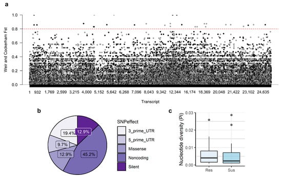 Genetic differentiation (FST) between susceptible and resistant groups (a) and characterization of the SNPs with FST≥0.80 (b,c). (a) Manhattan plot of FST values obtained between susceptible and resistant samples. The red intermittent line indicates FST = 0.80. (b) SNP effects of the SNPs with FST ≥ 0.80. (c) Nucleotide diversity (π) of the regions containing the SNPs with FST ≥ 0.80, calculated using a sliding window of 200 bp. Res—resistant; Sus—susceptible.