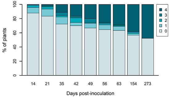 Pine wilt disease symptoms progression in Pinus pinaster plants according to a symptoms scale of 0 to 4. This scale is based on the percentage of wilting or brown needles in each observed plant: 0—0% of the needles presented symptoms; 1—1 to 25%; 2—26 to 50%; 3—51 to 75%; 4—76 to 100%. Dpi—days post-inoculation.