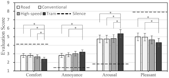 - Kuwano, S.; Namba, S.; Okamoto, T. Psychological evaluation of sound environment in a compartment of a high-speed train. J. Sound Vib. 2004, 277, 491–500. [Google Scholar] [CrossRef]