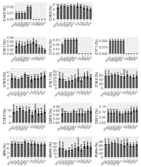 - Byfield, G.E.; Upchurch, R.G. Effect of temperature on delta-9 stearoyl-ACP and microsomal omega-6 desaturase gene expression and fatty acid content in developing soybean seeds. Crop Sci. 2007, 47, 1698–1704. [Google Scholar] [CrossRef] [Green Version]