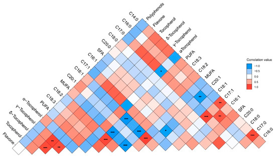 The correlation between the chemical characteristics of walnut oil. Note: *, **, and *** indicate significant correlations (p ˂ 0.05, 0.01, and 0.001) between the 19 chemical characteristics of walnut oil, respectively.
