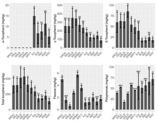 The contents of tocopherol, polyphenols, and flavone in walnut oil are shown in Figure 3. Three forms (α, γ, and δ) of tocopherol were detected. The total tocopherol values ranged from 109.55 (RXC) to 428.81 mg/kg (SRLD). The results clearly indicated that the predominant tocopherol form of walnut oil of iron walnut, common walnut, and the hybrid walnut trees was γ-tocopherol (86.11–350.89 mg/kg), with a proportion of more than 70%. The γ- and δ-tocopherol contents of the hybrid walnut oil were significantly higher than that of common and iron walnut oil while α-tocopherol was only detected in the iron and common walnut oil. The results of the correlation analysis showed a significant positive correlation among the contents of δ-tocopherol, γ-tocopherol, and tocopherol (Figure 2). We also studied the effects of species, climatic factors, and genotype–environment interaction on the micronutrient and secondary metabolite contents based on the design of two cultivation sites (Jiulong and Leibo) of two species (iron walnut and hybrids). The results of the two-way ANOVA showed that only the species effect was significant, which indicated that genetic determinism may be the main factor affecting the tocopherol content in walnut oil (Table 3). The flavone content ranged from 0.60–5.78 mg/kg and showed similar trends to tocopherol (Figure 3). The content of flavone was not influenced by the genotypic variation or cultivation sites alone but was affected by the interaction of species × sites (Table 3). The content of polyphenols was significantly influenced by the cultivation sites and the interaction of species × sites and showed opposite trends to tocopherol and flavone (Figure 3, Table 3). The polyphenols content of the common walnut oil was significantly higher than that of the hybrid walnut oil (F = 17.63, p ˂ 0.001), and 1.2 times higher than that of the iron walnut oil (F = 1.187, p ˃ 0.05) (Figure 3).