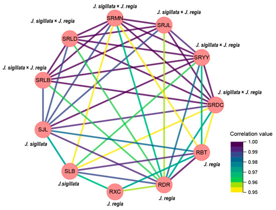 The results of correlation between sites/species also showed that high level of correlations were found between the same species, even though cultivated in different sites (Figure 4). For instance, a highly relationship existed between the cultivated site of Leibo and Jiulong with the same species (SRLB vs. SRJL), yet a lowly relationship existed between J. sigillata and J. sigillata × J. regia which cultivated in the same site (SRLB vs. SLB). Similarly results also occurred in the cultivated site of Jiulong, the relationship between SRJL and SJL was lower than SRJL vs. SRMN, SRJL vs. SRDC, and SRJL vs. SRYY.