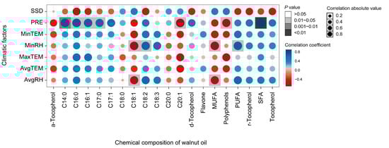 Correlation analyses of the climatic factors and chemical composition of walnut oil. Note: MinRH, minimum relative humidity (%); AvgRH, average relative humidity (%); AvgTEM, average temperature (°C); MaxTEM, maximum temperature (°C); MinTEM, minimum temperature (°C); PRE, precipitation (mm); SSD, sunshine duration (h); the same as below.