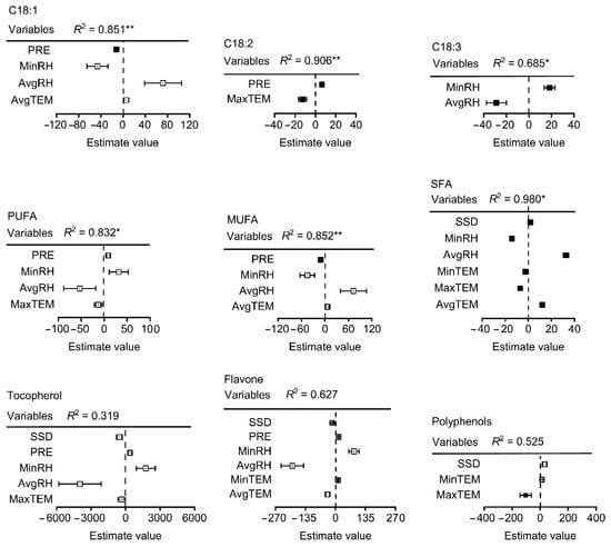 Results of multiple regressions after the selection process of the climatic factors affecting the fatty acid content of walnut oil. Note: Each variable was standardized before comparing effect sizes (squares) to determine differences in the strength of the predictor variables. Variables were selected based on a full set regression. Closed squares indicate significant effects (p ˂ 0.05) and lines indicate standard errors. * and ** indicate a significant difference (p ˂ 0.05, 0.01), respectively.