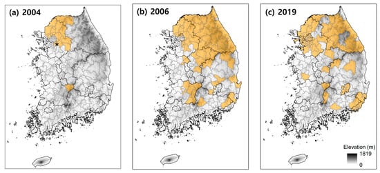 The occurrence areas (yellow color) of KOW in 2004 (a), 2006 (b) and 2019 (c) in South Korea. The asterisk indicates the first occurrence area (i.e., Ibaejae in Seongnam, South Korea) of KOW reported in 2004. The gray color indicates elevation. The graphs were drawn based on data from Annual Report of Monitoring for Forest Insect Pests and Diseases in Korea [].