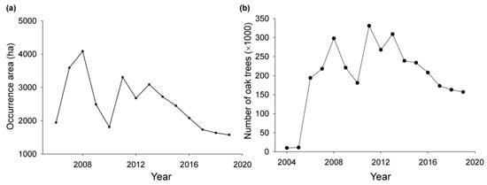 Annual changes in area (ha) damaged (a) and the number of dead oak trees (b) caused by KOW from 2004 to 2019. The graphs were drawn based on data from Korean Forest Service (www.forest.go.kr (accessed on 1 March 2022)).