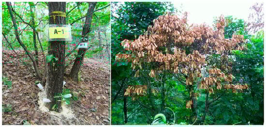 - Um, T.-W.; Chun, J.-H.; Kim, K.H. Stand structure characteristics of oak wilt infected forest, Korea. Korean J. Environ. Ecol. 2009, 23, 220–232. [Google Scholar]
